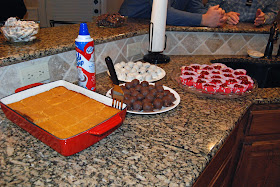 And then came the desserts. Oh, my! There were mini cherry cheesecakes, Oreo Cookie balls, Nutter Butter Cookie balls, Chocolate Dipped Pretzels and Paula Deen's Pumpkin Goeey Butter Cake.